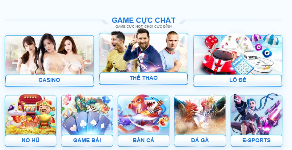 - Các loại thể loại cá cung cấp: Casino, thể thao, bắn cá, jackpot, lô đề, game bài, Esport, đá gà, mini game.